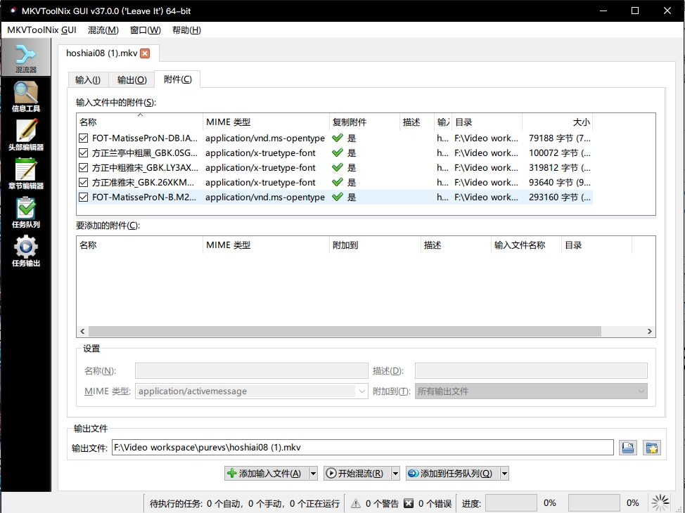 我们打开mkvtoolnix,把output中的字幕加入字幕轨道,在附件中把子集字体拖进去,封装就好了