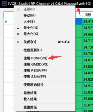 首先我们打开软件本体,由于RPChecker的FFMPEG模式有那么一点……不靠谱,所以建议将Portable版VS的文件夹(就是vspipe.exe在的那个文件夹)添加入系统PATH中,右键左上角的RP图标,右键选择使用PSNR(VS)